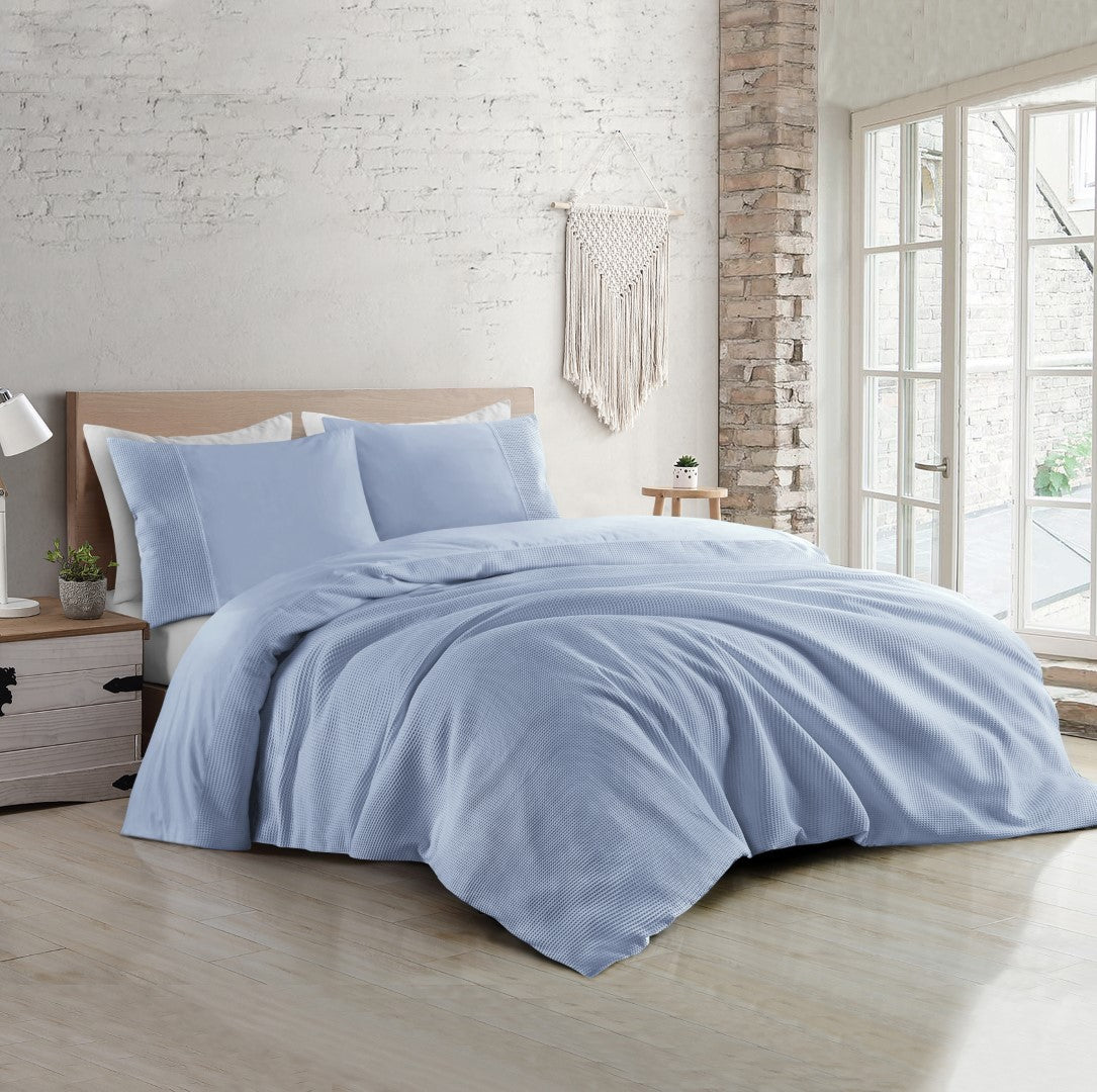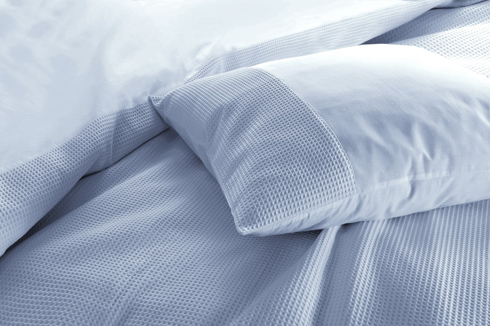 Omarm de rustgevende uitstraling van het Papillon Mendoza dekbedovertrek in een zachte lichtblauwe kleur. Het subtiele wafelpatroon brengt een serene sfeer in je slaapkamer, waardoor elke nacht voelt als een warme, liefdevolle omhelzing.