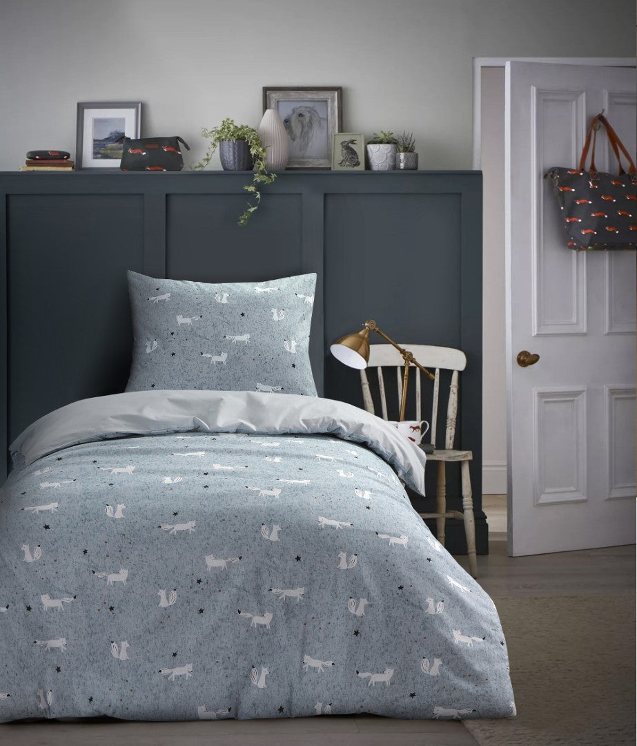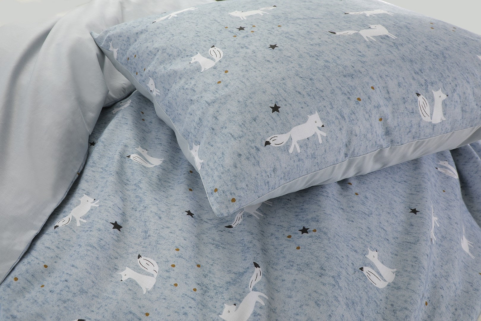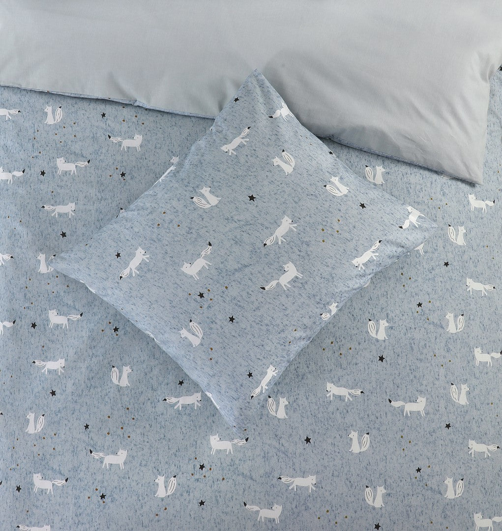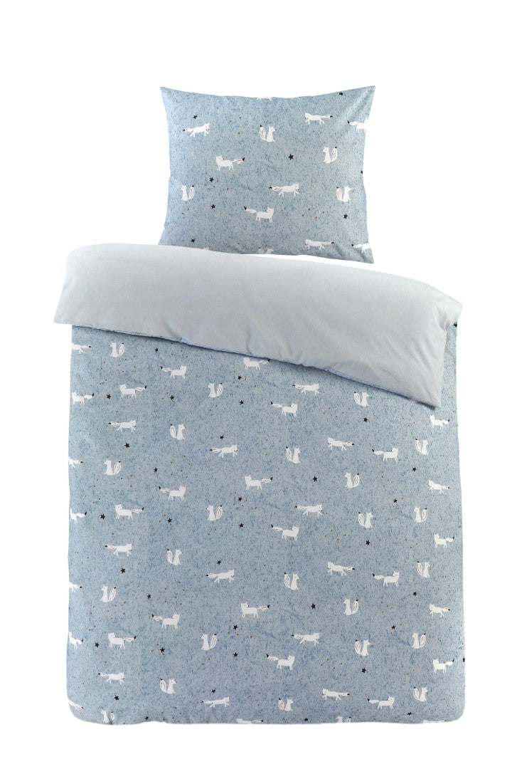 Een lichtblauwe achtergrond die bedrukt is met vrolijke vosjes.