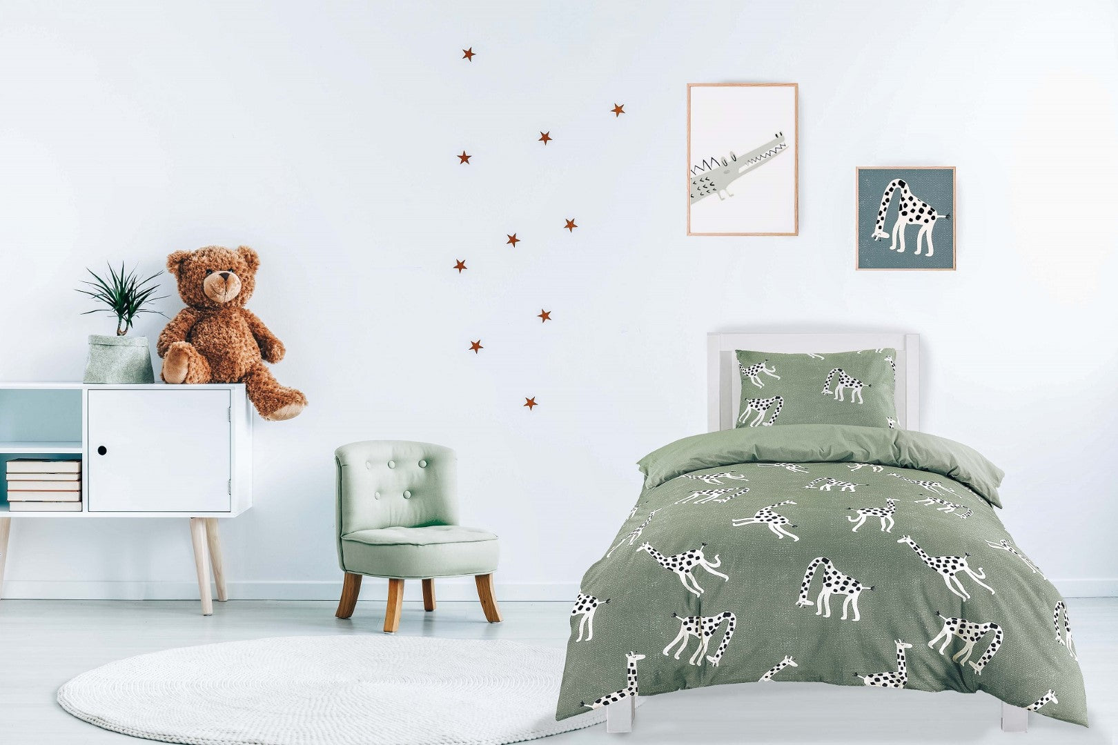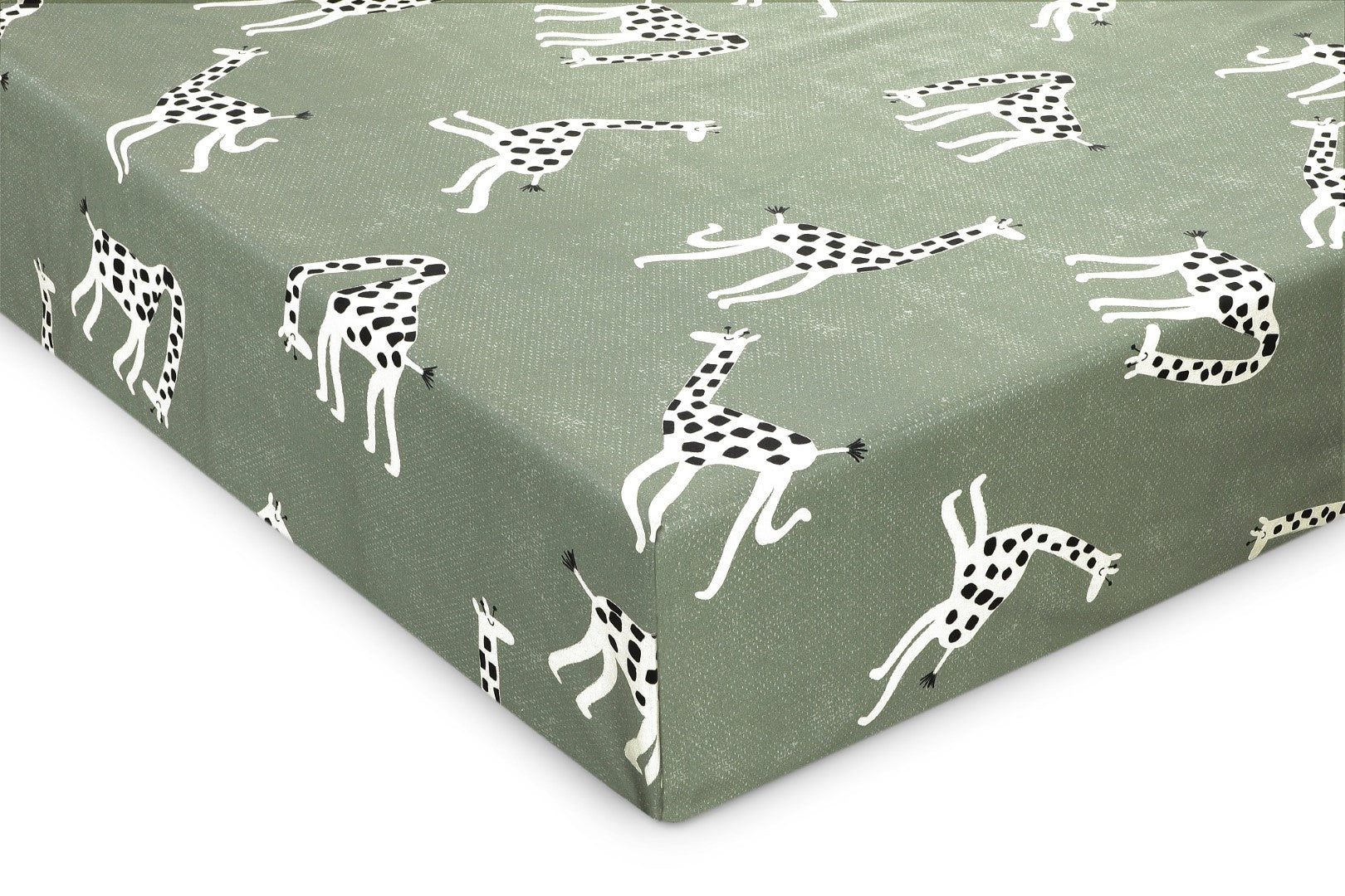 Een groene achtergrond die bedrukt is met vrolijke witte girafjes.