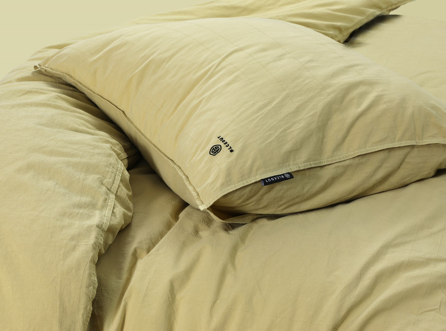 Een stoere en tijdloze set kussenslopen. Het ingeweven blokpatroon en de afwerking met een jeansstitch geven samen een prachtig effect. De mooie gele kleur maken van deze slopen een echte eye-cather. Deze kussenslopen komen uit dezelfde serie als de dekbedovertrekken.